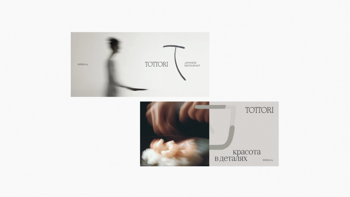 2. Айдентика ресторана TOTTORI, созданная вместе с нейросетью, передает атмосферу «тайны нацукаши» — воспоминания о приятных моментах. Каллиграфический иероглиф и минималистичная графика, вдохновленные японскими дверьми фусума, усиливают эффект загадочности и закрытого клуба.