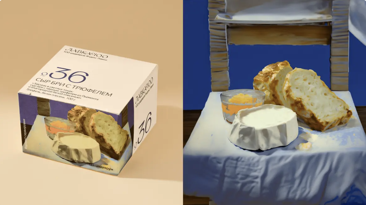 1. Лавка 100 — проект Яндекс Лавки, в котором совместно с нейросетью YandexART была создана упаковка для продуктов, передающая состав и ключевые характеристики.