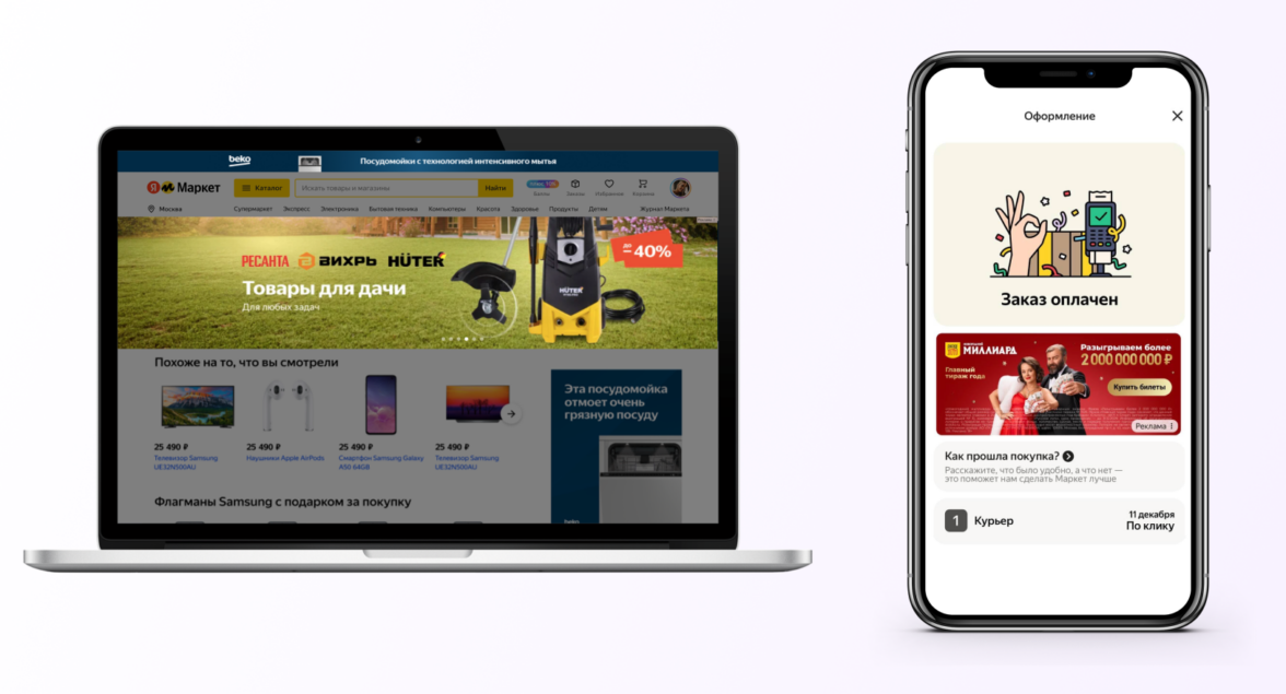 Яндекс Маркет — баннер и видеобаннер на главной странице, баннер-растяжка над поисковой строкой, баннер на странице «Заказ выполнен».