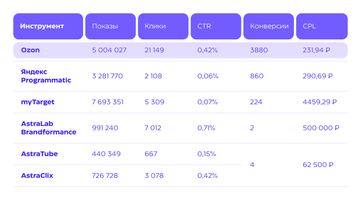 Вместе с выставкой современного искусства получили конверсии на уровне перформанс-инструментов, разместив баннеры и видеобаннеры на главной Ozon, а также на странице «Заказ выполнен». Собрали 78% конверсий и получили самый низкий CPL в сравнении с другими инструментами, используемых в кампании.