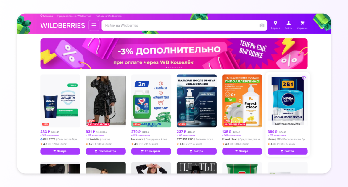 84% россиян покупают на маркетплейсах. Неплохо, да? Причем приходят они туда не только за одним конкретным продуктом. 40% покупателей любят листать каталоги, а 32% и вовсе изучают раздел с рекламой и подборкой товаров на главной странице. Баннеры выглядит вполне нативно, а скидки и акции вызывают больший интерес, чем на площадках, где пользователь не готов потреблять рекламный контент.