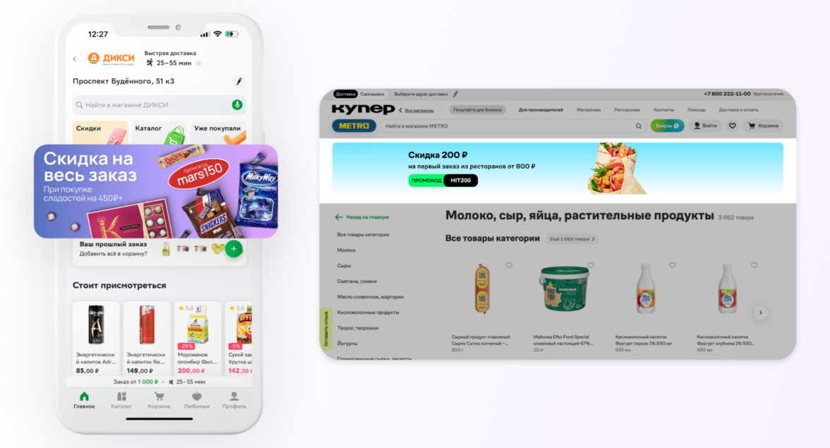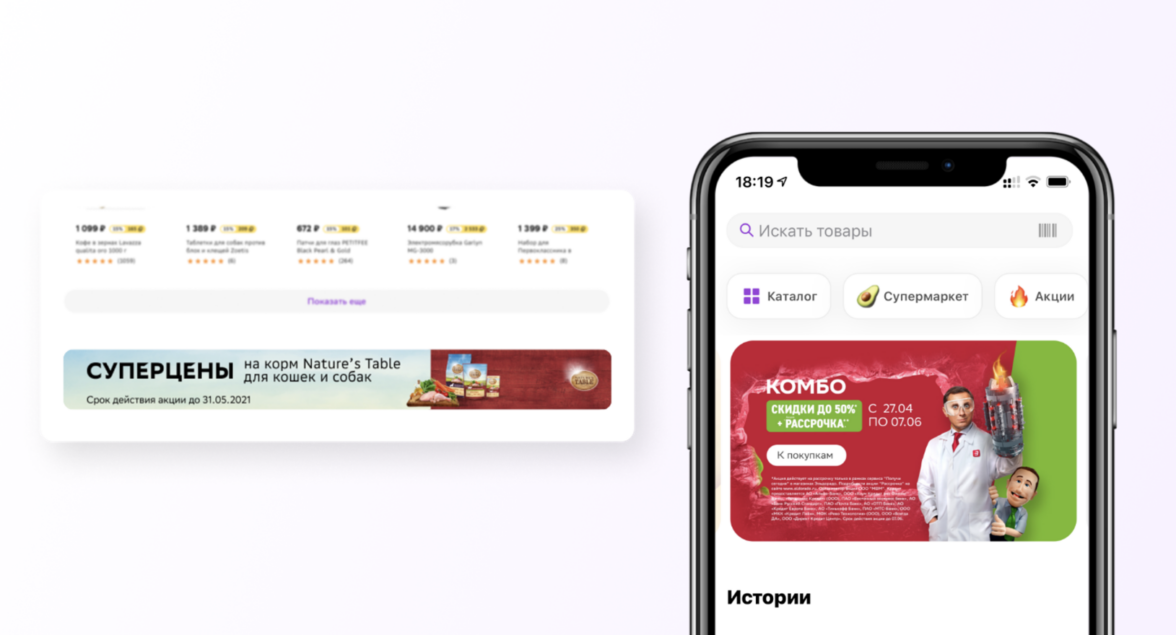 Мегамаркет — баннер на главной странице на основном слайдере и на втором уровне, баннер-растяжка на главной, баннер в разделе «Акции» и другие медиаформаты площадки.