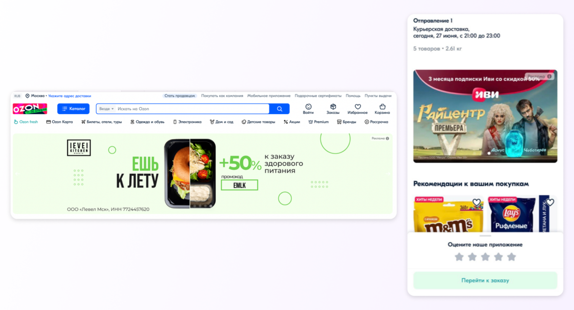 Ozon — баннер на главной и в поиске, видеобаннер на главной и в ленте рекомендаций, промо-баннер на главной, баннер на странице «Заказ выполнен».