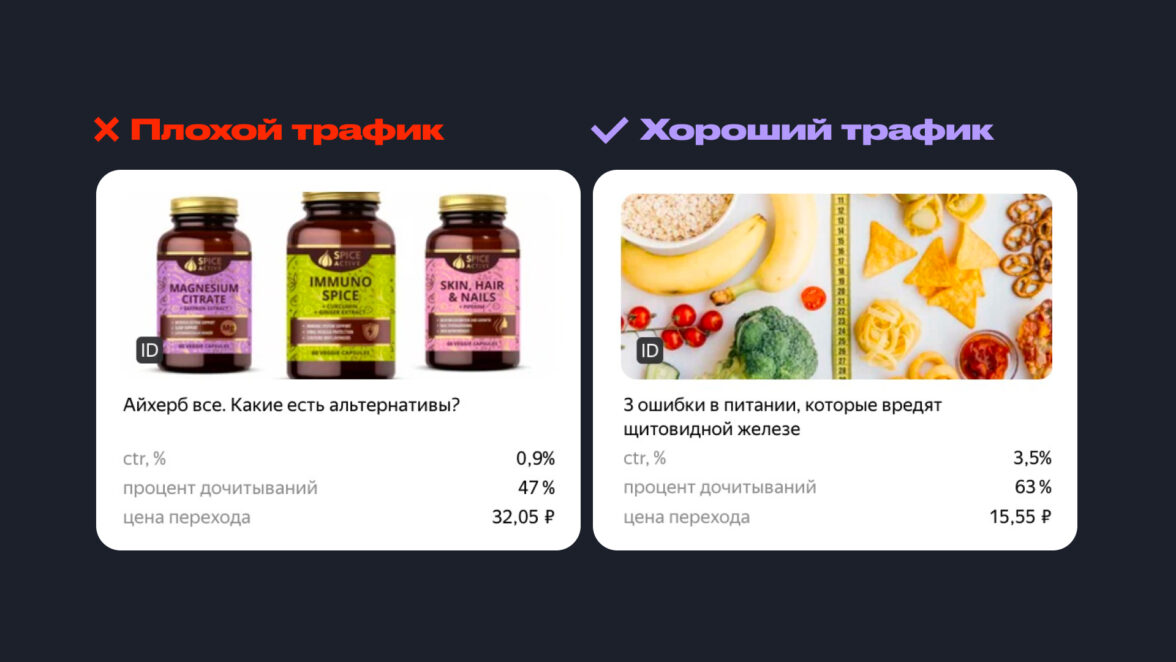 Главное — следить за качеством трафика. Мусорный трафик никому не нужен. Об этом ярко сигнализируют такие метрики, как процент дочитываний, процент переходов из статьи и конверсии в маркетплейсе (например, процент добавлений в корзину).