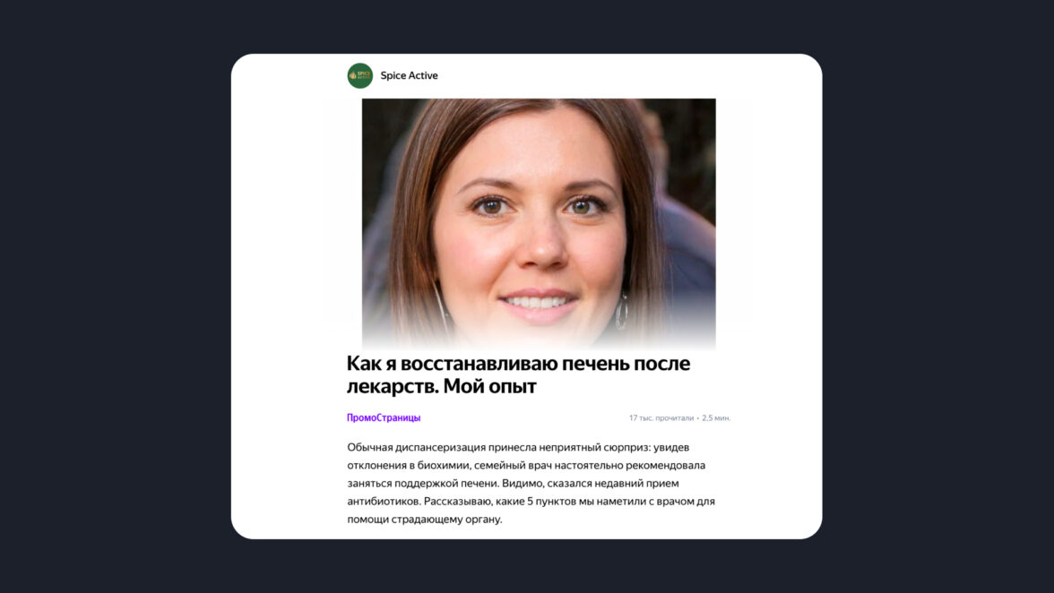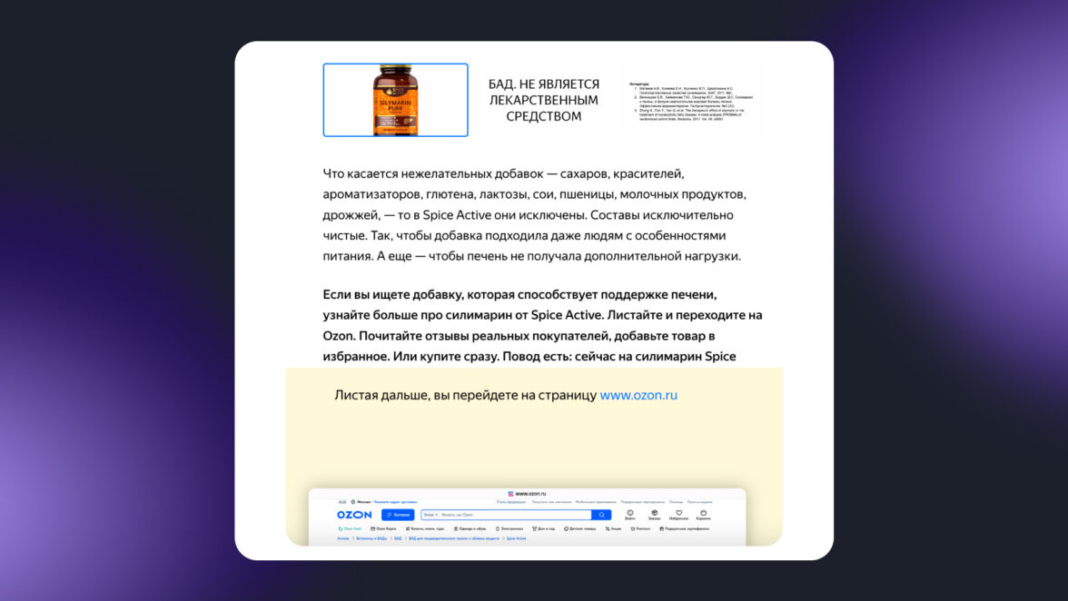 Да, мы вновь взяли ту же историю про «принимал что-то», но подали её в другом формате — повествования от первого лица. Здесь знатоки ФЗ «О рекламе» скажут, что нативы в фарме нельзя. Но есть нюанс: нельзя, чтобы материал «содержал ссылки на конкретные случаи излечения людей, улучшения их состояния в результате применения таких добавок». И об этом мы ничего не пишем! Наша героиня меняет питание, добавляет спорт и узнает, какие добавки могут ещё помочь. Да, она делает заказ. Но в тексте ещё даже не получает свою баночку.