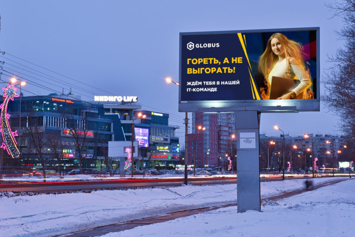 «В 2021 году сразу после отмены локдауна Globus IT провел масштабную рекламную кампанию. Главная цель — повысить узнаваемость бренда в Нижнем Новгороде среди ИТ-специалистов и студентов вузов технических специальностей, рассказать целевой аудитории о нашей компании как отличном месте для стажировки и работы и, по возможности, закрыть ряд вакансий. Мы разработали комплексный подход: для широкого охвата идеально подошла наружная реклама, для адресного взаимодействия — использовали таргетированную рекламу в соцсетях. Специально для этого мы создали 36 макетов, главными героями которых стали сотрудники компании. Адресная программа включала более 15 поверхностей разного формата, часть из которых предоставило РА “МОСТ”. Для размещения были выбраны самые оживленные места и транспортные развязки, в том числе рядом с вузами. Главную цель мы достигли. Узнаваемость бренда однозначно выросла. Благодаря комплексному охвату ЦА мы быстро нашли общий язык с вузами и в дальнейшем начали ряд совместных проектов, таких как открытие Стартап-лаборатории на базе Университета Лобачевского. А в стажировке — и на летнем курсе-интенсиве по Java от Globus. Academy приняли участие больше сотни студентов технических вузов. Но вот быстро закрыть существующие вакансии посредством данной ООН-рекламы не получилось. Тем не менее после проведения РК все респонденты отмечали, что слышали о Globus IT».