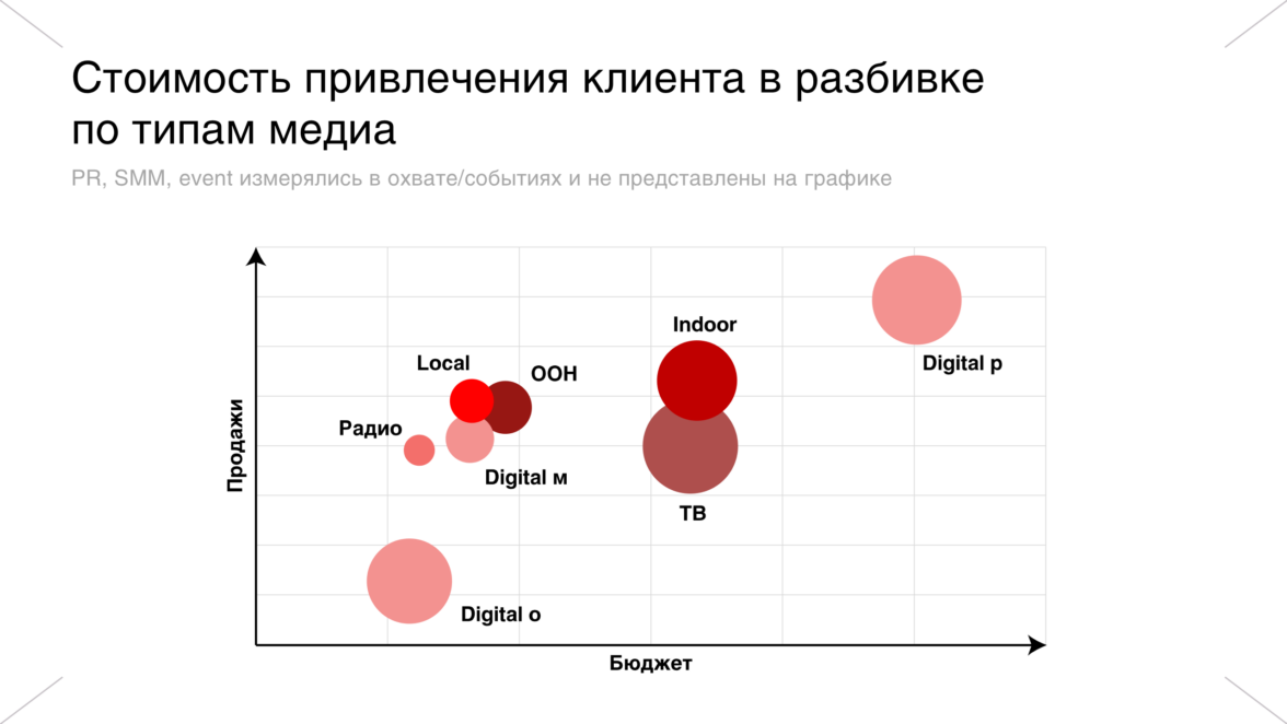 Интересно, что по объёму бюджетов, стоимости привлечения и вкладу в продажи indoor-размещения практически сравнялись с ТВ-рекламой. И клиент задался вопросом — на что тратить деньги, indoor-размещения или ТВ? Ответ зависит от задач бренда: если растим знание — то в ТВ, если нужен контакт близко к моменту использования (для повышения конверсии в нижней части воронки) — подойдут indoor-размещения.