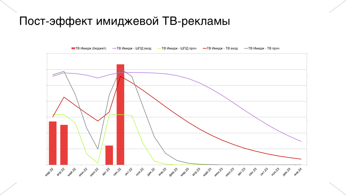 5. В чём ТВ-реклама отличалась — так это в долгосрочном пост-эффекте (Рисунок 1). Запущенная ещё в 2022 году имиджевая рекламная кампания обеспечила долгосрочный рост входящих продаж как ШПД, так и ТВ-продуктов. Эффект усилил параллельный запуск в ключевых городах присутствия и высокая доля голоса вплоть до 40% (вы помните, что это важно).