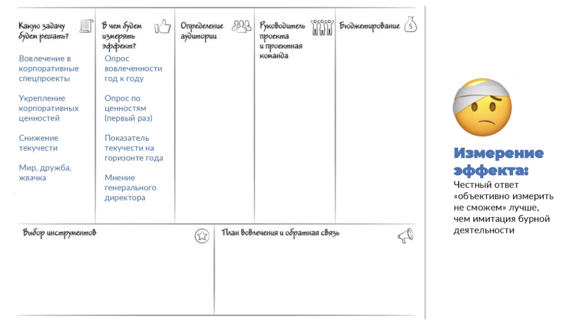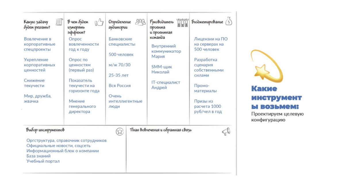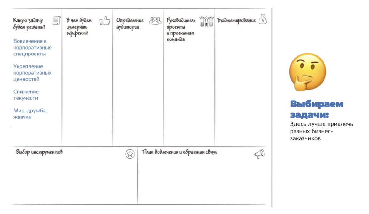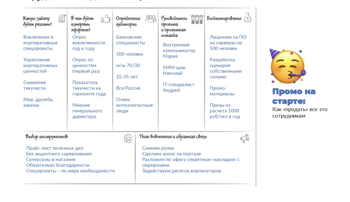 И последний пункт — вишенка на торте: как будем вовлекать сотрудников и продвигать новое решение? Что сделаем, чтобы сотрудники заходили на портал и активно им пользовались?