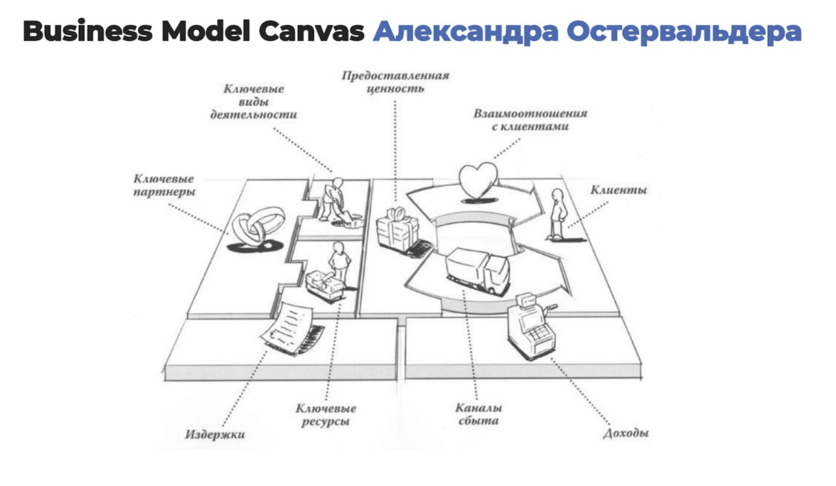 Для этих целей возьмём за основу Business Model CanvasАлександра Остервальдера. Эта модель широко известна в предпринимательских кругах, так как изначально создавалась для предоставления понятной и наглядной картины бизнес-модели нового бизнеса или нового направления в уже существующем. Она помогает понять, что мы собираемся продавать, кому, по какой ценовой политике, какие партнёрства и каналы сбыта использовать, а также что потребуется для реализации проекта.