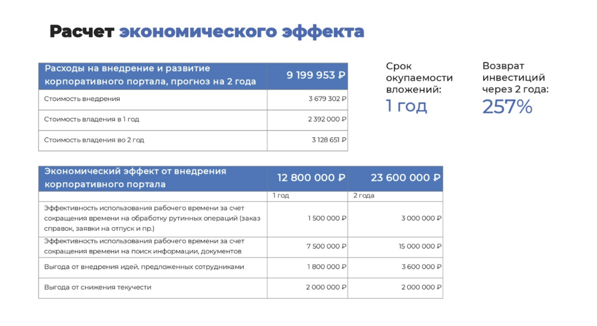 Самостоятельный расчёт возврата инвестиций (ROI). Приведем пример расчёта.Допустим, в компании 1000 сотрудников, каждый из которых в среднем 10 раз в год запрашивает справку. На обработку одной справки вручную уходит полчаса. Если автоматизировать процесс, время сократится до 10 минут. Учитывая среднюю зарплату сотрудника, который занимается обработкой, легко рассчитать экономию.Без портала затраты на обработку справок составляют, например, 5 миллионов рублей в год. С порталом и автоматизацией — 3,5 миллиона.