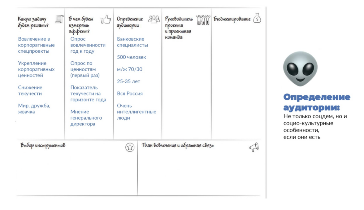 Определение аудитории также поможет адаптировать проект под конкретный контекст. Например, при запуске геймификации, если аудитория возрастная, анонсировать проект можно как «программу признания и поощрения лучших». А если аудитория молодая — можно добавить больше драйва, например, в стиле «Standoff» или гонок