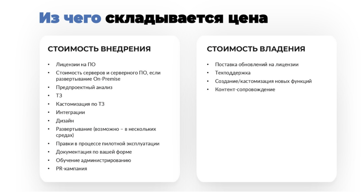 Стоимость владения: в тендерах часто просят указать не только стоимость внедрения, но и стоимость владения на 5 лет. Это важно, потому что после внедрения у вас всё равно будут затраты: