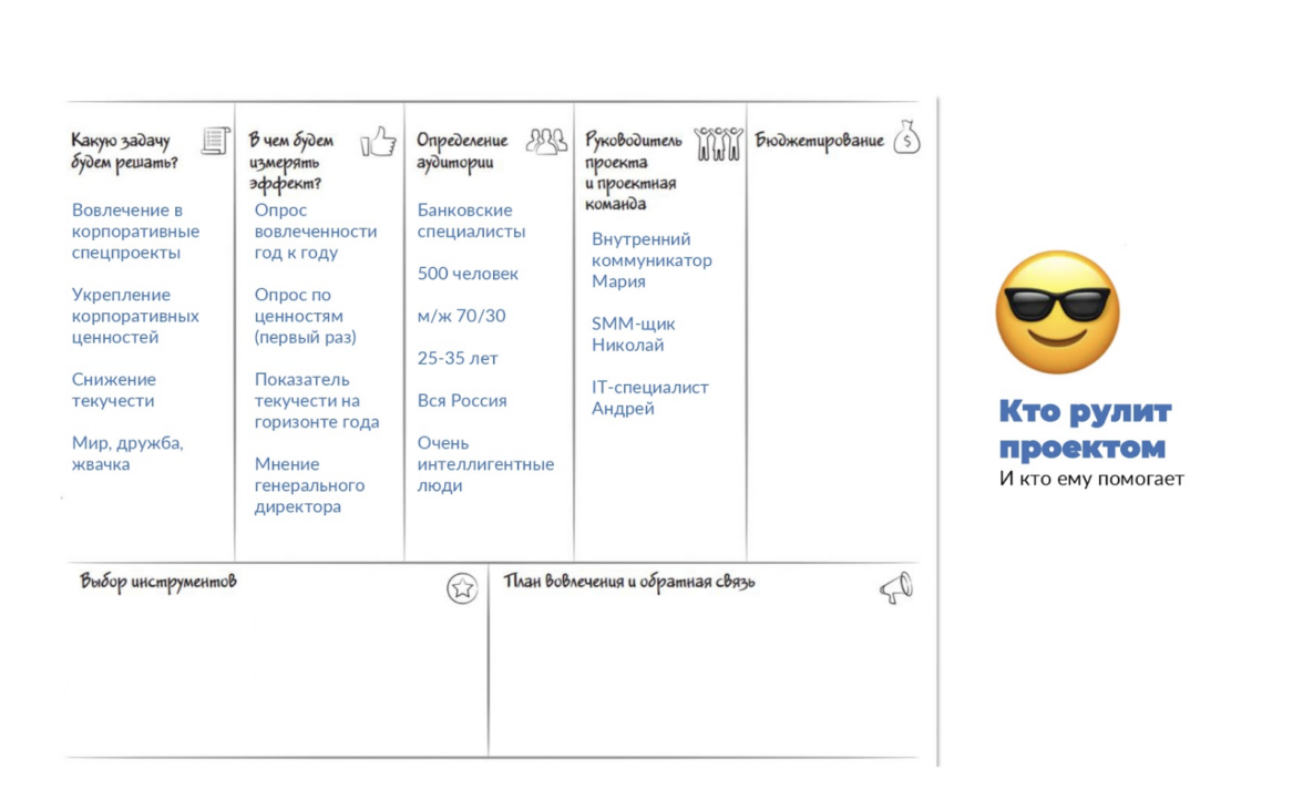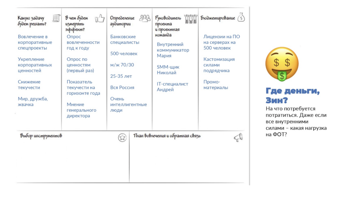 Во-первых, есть ли у проекта руководитель и, конечно, для технических решений всегда нужны IT-специалисты. Стоит заранее также обсудить детали с «безопасниками» — это позволит понять будет проект развернут во внутреннем контуре или можно ли использовать «облака», и маркетологами, чтобы привлечь ресурсы для развития проекта. Задача показать, что команда сформирована, и директору не нужно ни о чём беспокоиться. «Пожалуйста, дайте мне таких-то людей, они необходимы для реализации».