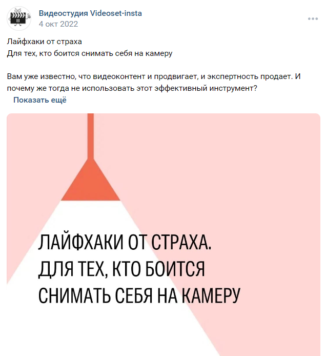 Пять вертикальных видео для VK, Instagram/Facebook*, Дзена и телеграм-канала. Кстати, видеоконтент для соцсетей я создаю пакетно: выделяю один день и снимаю много материала сразу. Всем рекомендую именно такой подход, он экономит массу сил и времени. Так я обеспечиваю себя постами и роликами на месяц вперёд, и у меня не болит голова о том, что нечего публиковать.