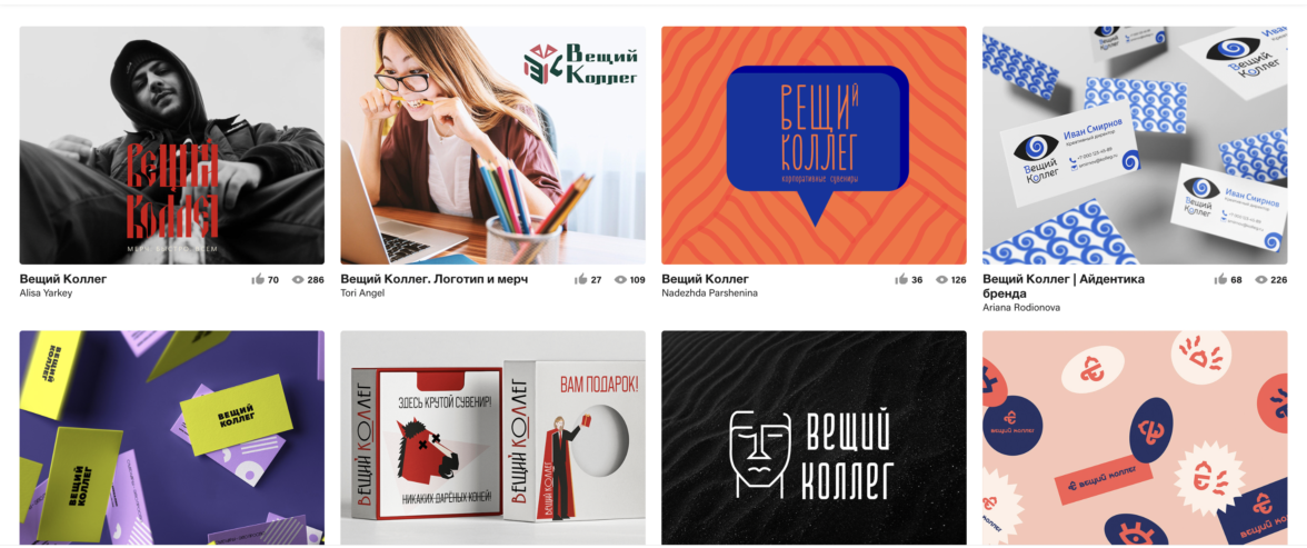 Когда мы задумывали идею с интенсивом, то надеялись получить хотя бы 10–15 работ. Но все пошло иначе. Ранним рабочим утром мы заглянули на Behance и посмотрели, как там дела у нашего друга. Ввели «Вещий Коллег» и увидели гигантское полотно из сотни работ. Все были выполнены в разной тематике: гранж, неон, авангард, брутализм и чего там только не было. Дизайнеры с радостью брались за воплощение идеи. В портфолио молодого специалиста редко можно встретить какой-то креативный и нестандартный проект. Поэтому возможность сделать кейс с прикольным названием и идеей была принята на ура.
