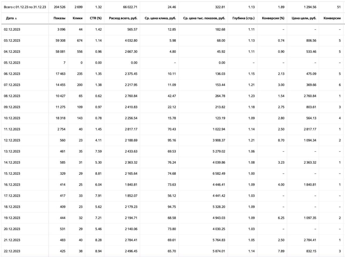 После чистки запросов и выделения конвертящих ключевых слов удалось снизить цену лида сначала до 1200 рублей, потом до 700–800 рублей! Всего за декабрь получили 51 заявку + входящие звонки с сайта.