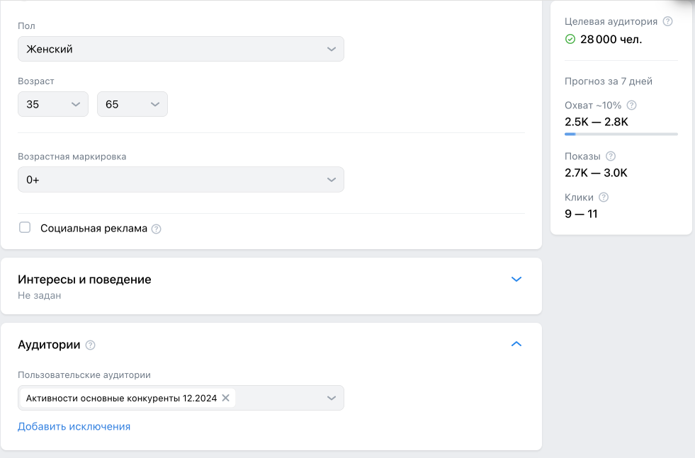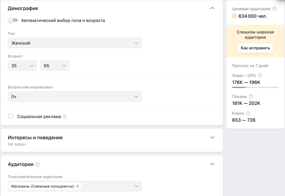 Помимо таргетирования на узкие аудитории проводили дополнительные тесты на более широкие аудитории, но ключевые результаты в среднем выходили дороже на 50–70%. Пример настроек такой аудитории: