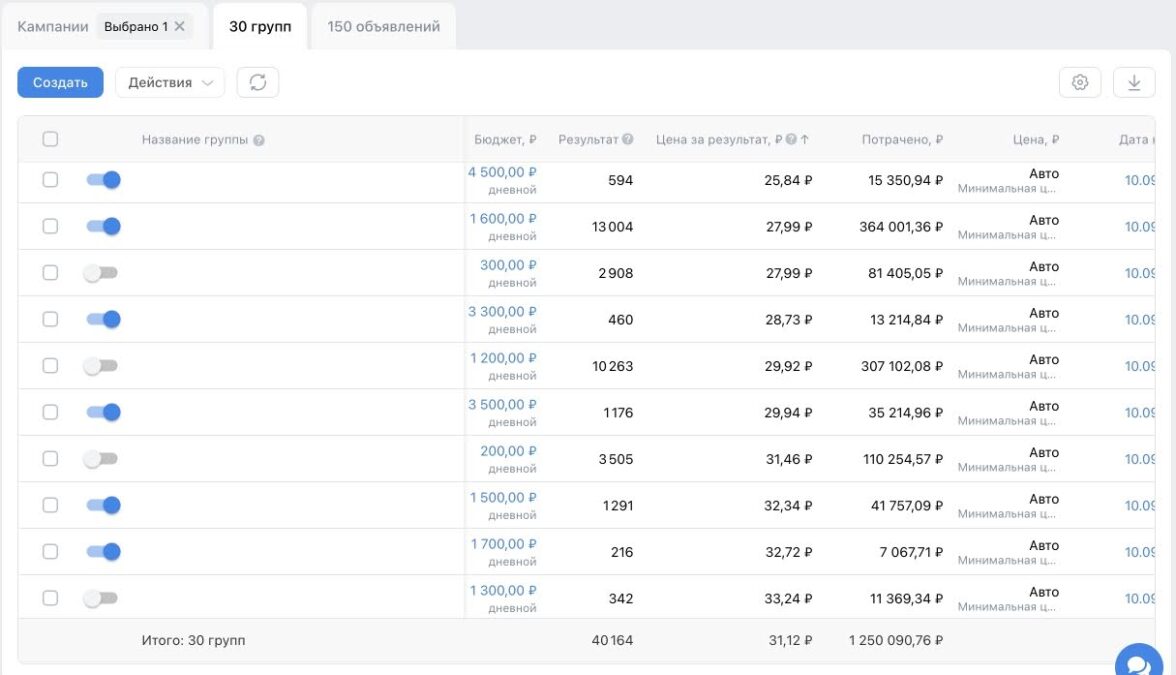 Также по кабинету видно, что в тестировании участвовало большое количество аудиторий — свыше 200. Они включали в себя комбинацию из широких и узких сегментов, основные из которых приведены в кейсе. Объемный тест аудиторий необходим для поиска наиболее заинтересованного «теплого» сегмента, поэтому мы не ограничиваемся несколькими группами.