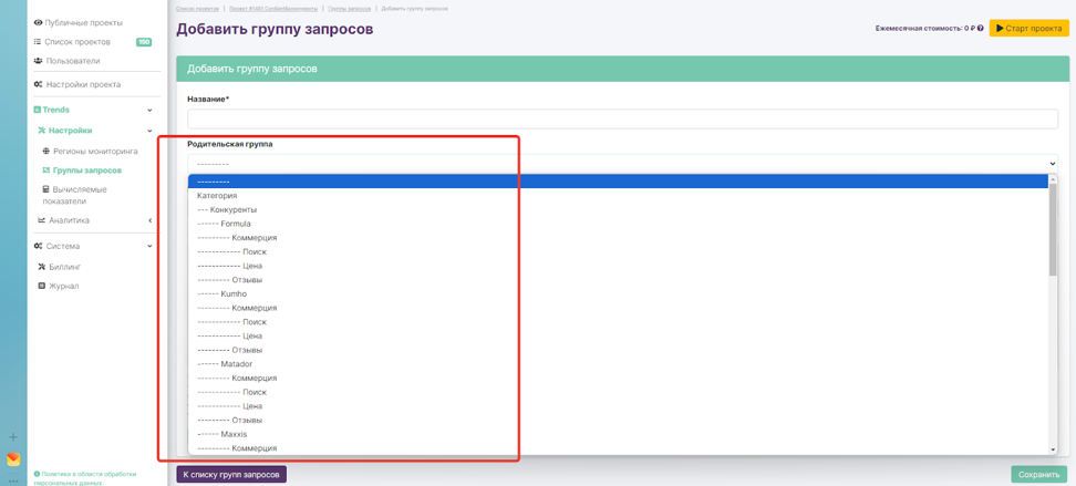 Следующий раздел «Группы запросов». Для удобства пользователей в проекте автоматически создается начальная иерархия групп для добавления запросов. Но вы можете добавить свои любые группы запросов и далее под них создать вычисляемые показатели. Все созданные группы можно редактировать.