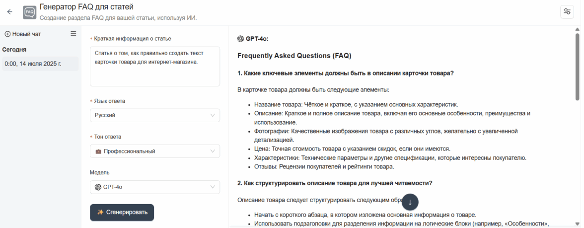 Ключевые мысли лучше размещать в компактных абзацах или оформлять в виде списка. Дополнительно можно включить блок FAQ в конце статьи — он идеально подходит для кратких ответов. Чтобы создать раздел с FAQ с помощью нейросети, воспользуйтесь этим инструментом.