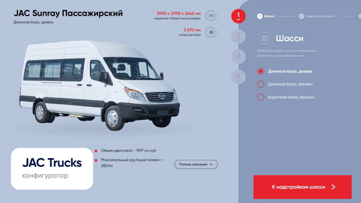 А если сложный и для узкоспециализированных ниш: вот пример из реальных проектов. JAC Trucks, один из крупнейших поставщиков спецтехники в Казахстане получил конфигуратор, в котором клиент собирает авто от шасси до ковриков в салоне — тут еще и срабатывают перекрестные продажи.