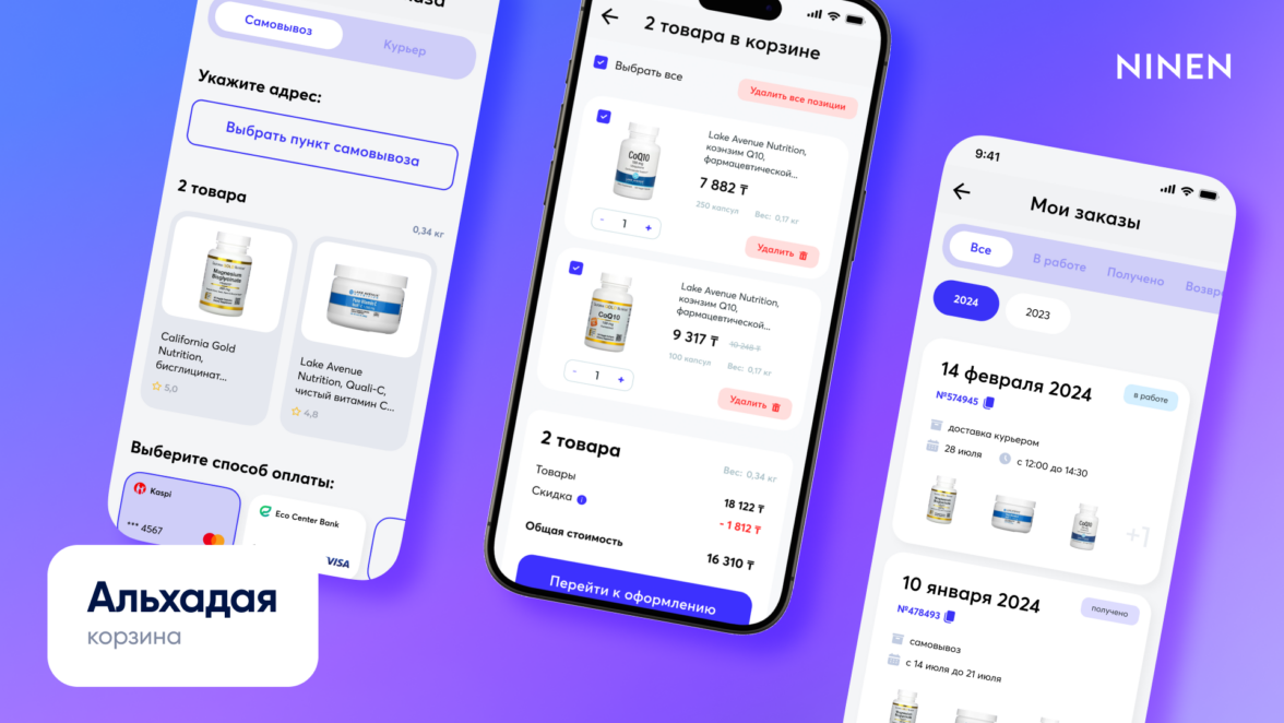 Пример из реальных проектов — кроссплатформенное приложение-маркетплейс для производителя БАДов Альхадая. Даже на маленьком экране можно разместить максимально функциональную Корзину: выбор способа доставки и оплаты, адреса пунктов самовывоза, товары с ключевым описанием, отслеживание истории — есть абсолютно все. А посмотрите, насколько круто выглядит в дизайне: абсолютно «воздушно», интуитивно и эстетично.