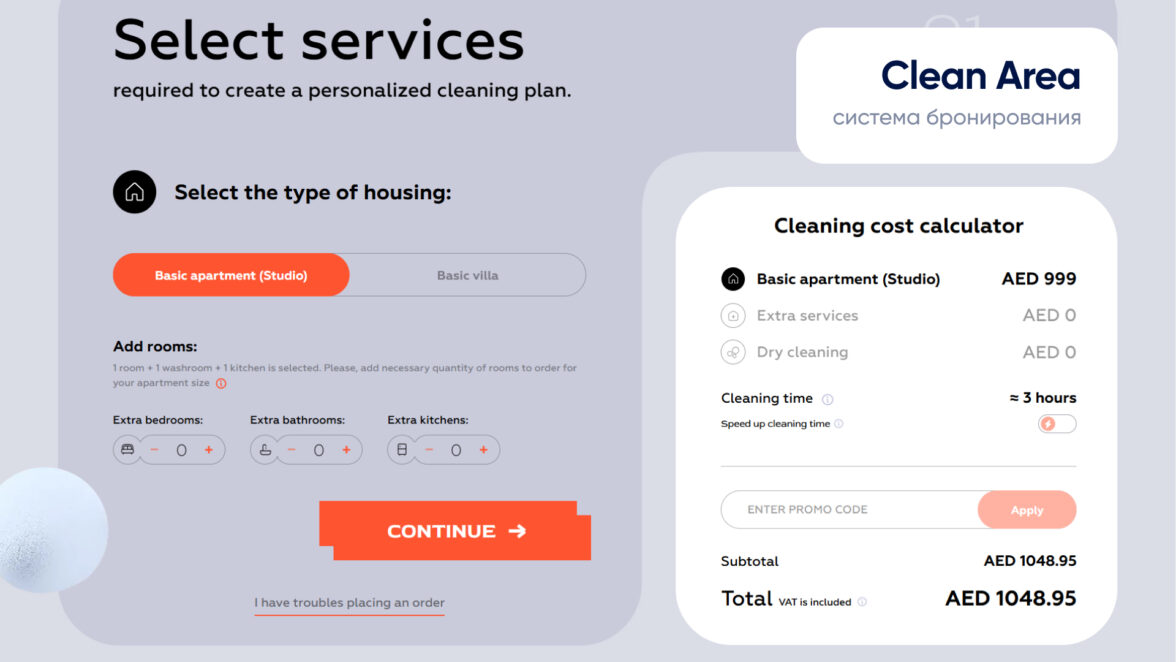 Пример из реальных проектов: Clean Area, услуги премиального клининга в Дубае. Мы на 100% автоматизировали расчет стоимости и процесс приема платежей, внедрили календарь записей и прозрачный механизм управления расписанием, даже учет промокодов и скидок — все это в рамках одного инструмента.
