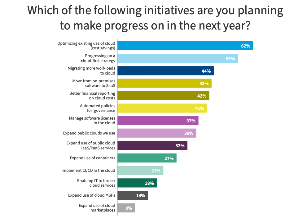 Данные Flexera показали, 62% респондентов считают своей главной инициативой в 2024 году оптимизацию существующего использования облака, а 44% хотят перенести большое количество рабочих нагрузок в cloud-среду.