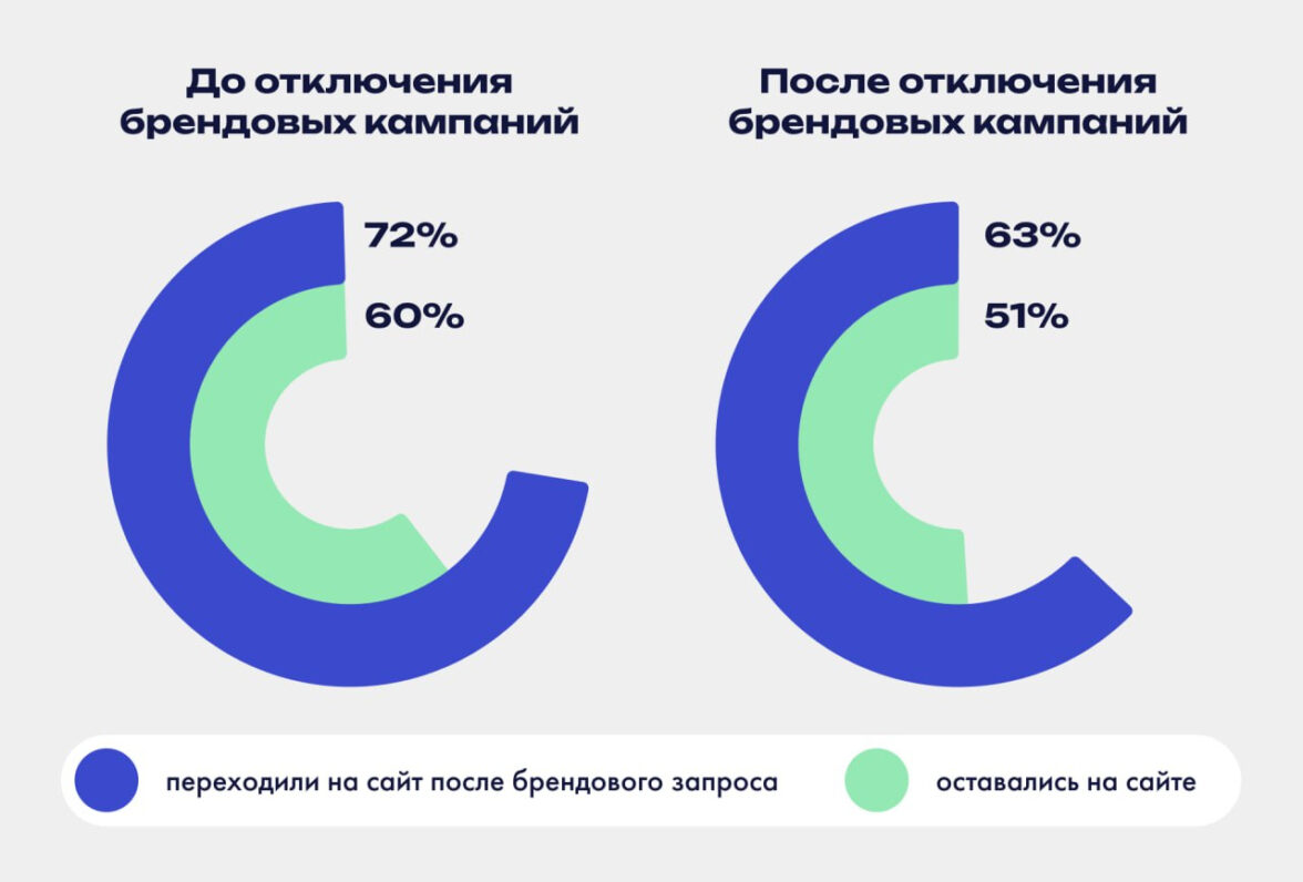 Выяснилось, что брендовые кампании привлекали более заинтересованную в покупке аудиторию. До отключения кампаний на сайт переходили 72,1% пользователей, вводивших название бренда, и 60% оставались на сайте. После отключения кампаний по SEO-ссылкам переходило чуть больше половины (63,5%) пользователей, запрашивающих бренд, и только 51% оставался на сайте. Это говорит о том, что органическая выдача привлекает не только меньшую, но и не столь качественную аудиторию.
