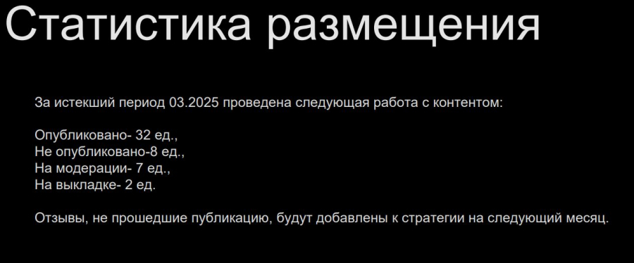 В рамках SERM недостаточно просто указать, что «работа велась». Важно показать структуру: сколько отзывов обработано, сколько размещено, сколько отклонено модераторами и какие ещё находятся в процессе. Это не только показатель продуктивности, но и способ зафиксировать масштаб реальной работы.