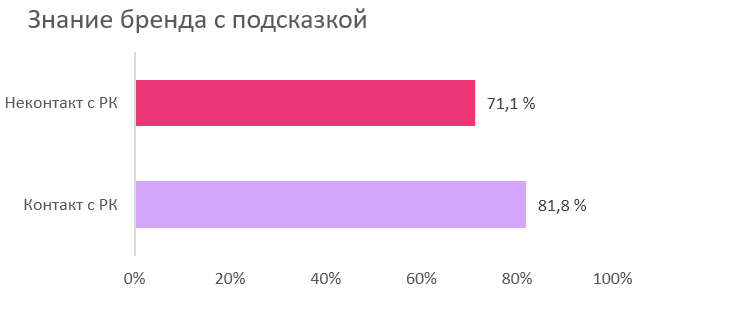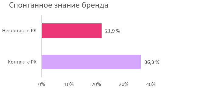 • Знание бренда заметно выше среди тех, кто видел рекламу: спонтанное – 36% против 22%, с подсказкой – 82% против 71%;