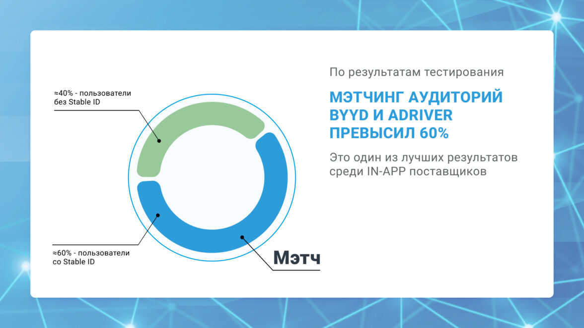 Отличная новость — кросс-канальная аналитика теперь доступна и в in-app сегменте. Это стало возможным благодаря интеграции платформы BYYD с верификаторами трафика Adriver и Weborama.