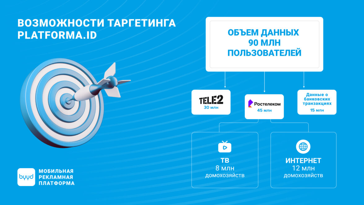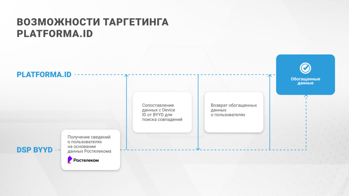 По запросу BYYD получает зашифрованные данные о нужных рекламодателю сегментах целевой аудитории — просмотры ТВ, посещения сайтов, транзакции.