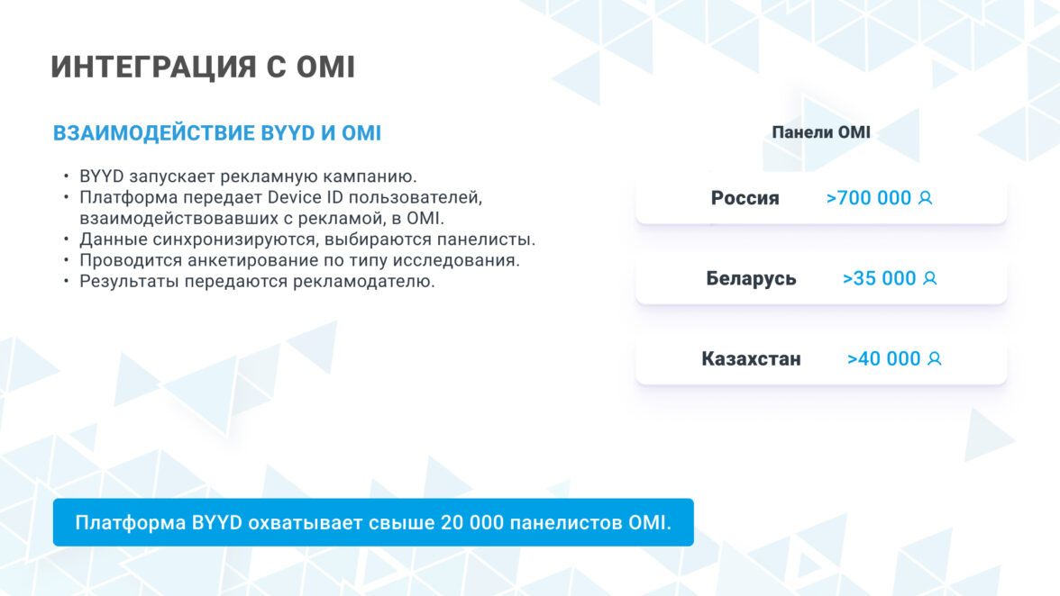 В прошлом году наша мобильная площадка расширила возможности верификации мобильного трафика за счет интеграции с панелью OMI. На текущий момент BYYD охватывает более 20 000 панелистов, а сами исследования проводятся с использованием методологии Brand-Lift study.