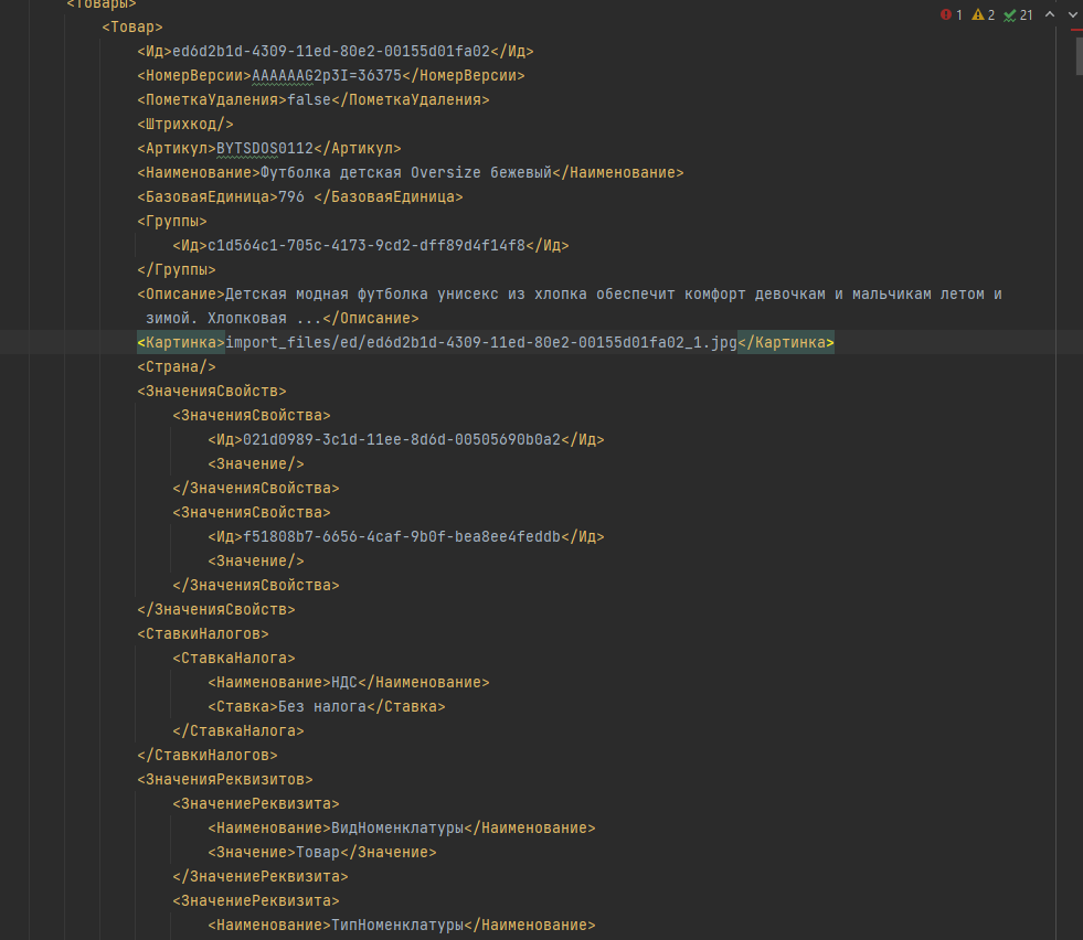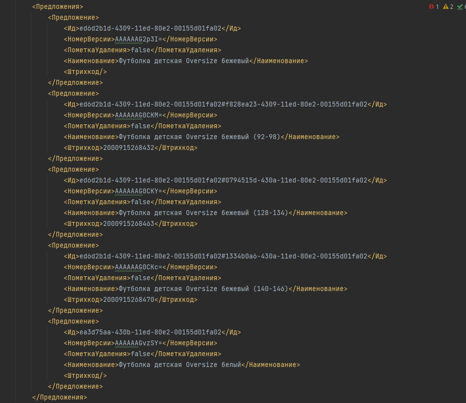 По сути в файле offers как раз содержатся уже непосредственно сами товары — то, что можно купить. Единственное, мы имеем в начале каждой группы одинаковых офферов товар-родитель: <Ид>ed6d2b1d-4309–11ed-80e2–00155d01fa02.