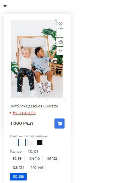 В общую карточку товара в списке товаров категории мы грузим сначала самое дешевое предложение и его вариант. Тут мы показываем футболку в цвете серый меланж, размер 152, так как ее цена 1000 рублей.