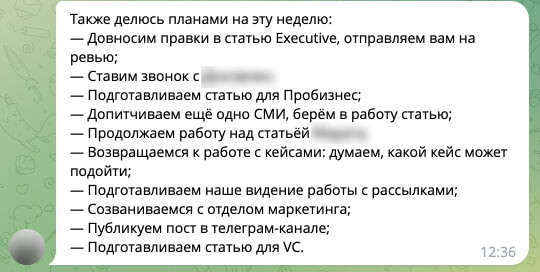 «Держать в курсе» — это отдельная полноценная задача пиарщика. С первыми клиентами мы порой совершали классические ошибки: не рассказывали о текущих статусах, не пинговали о проблемах и отвечали на сообщения слишком долго для хорошего клиентского сервиса.