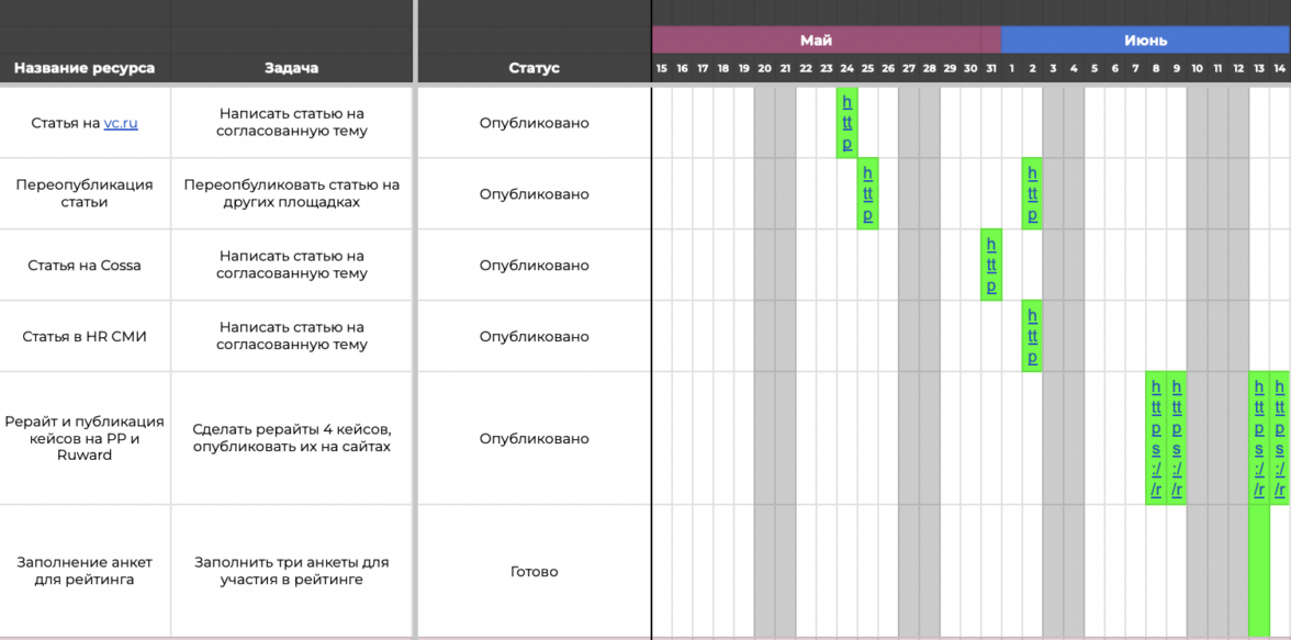 Планы на месяц и отчёты в формате диаграммы Ганта. Здесь и список задач, и календарный план со всеми активностями. Делаем что-то дополнительное — добавляем в самый конец в отдельный блок, а в конце месяца презентуем.