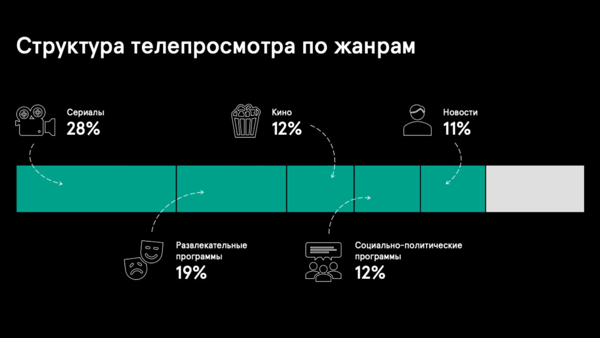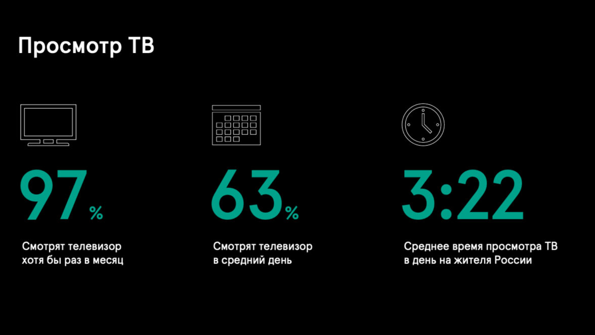 По данным Mediascope TV Index, на просмотр ТВ россияне тратят 3 часа 22 минуты. Учитывая переход в диджитал, более половины этого времени приходится на мобильные приложения.