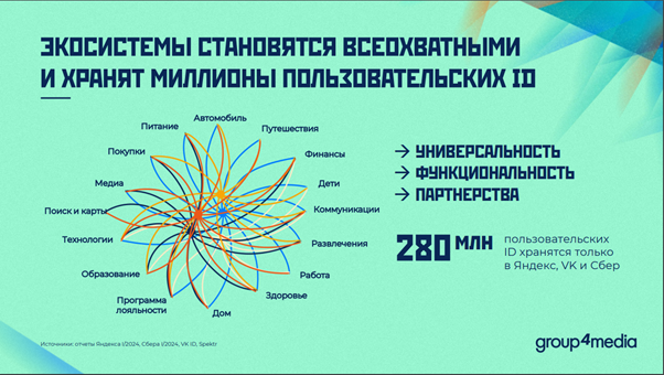 Более того, экосистемные игроки хранят миллионы данных (около 280 млн пользовательских ID только в «Яндекс», VK и «Сбер») и предлагают брендам инструменты для работы с ними по всей маркетинговой воронке.