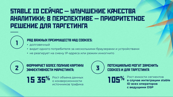 В настоящее время также активно растут проекты, которые основаны на возможностях стабильных индификаторов или Stable ID, которые улучшают качество аналитики, а в перспективе могут стать эффективным решением для таргетинга.