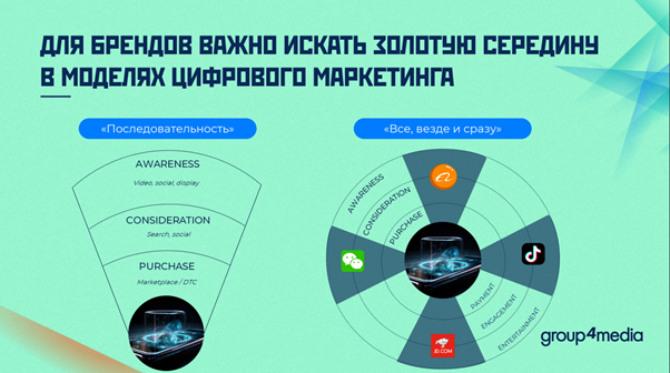 По словам эксперта, данная ситуация не уникальна и затрагивает множество стран. В настоящее время существуют две модели подхода к диджитал-маркетингу. На Западе, как правило, используется принцип последовательной активации нескольких диджитал-инструментов, каждый из которых решает свою задачу по воронке. Исходя из этой модели, наверху воронки идет привлечение внимания к бренду, после чего поток разогретой аудитории направляется в 1–2 канала продаж, где происходят транзакции. В то же время на Востоке популярна иная модель, когда большие экосистемы предлагают полный спектр взаимодействия с потребителем, а бренд представлен в каждой из частей воронки.