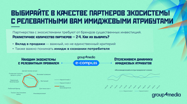 Бренды не могут работать со всеми крупными игроками, поэтому обычно ограничиваются 2–4 партнерствами. На этапе анализа потенциальных партнеров, помимо их вклада в продажи, компаниям важно понимать, какими имиджевыми атрибутами обладает партнер. Рекламный холдинг Group4Media решает эту задачу с помощью собственного инструмента «e-compass», который анализирует отношение россиян к 300 диджитал-проектам и позволяет выявить имиджевые атрибуты каждого из них.