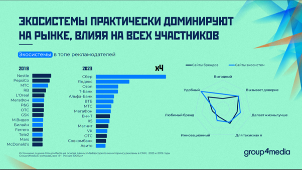 По сравнению с 2019 годом сегодня экосистемные игроки практически доминируют в медиа, управляя брендами и потребителями. Они могут выступать как партнерами, так и конкурентами, появившись в ранее не задействованном поле. Уже сейчас сайты экосистем лидируют для потребителей по имиджевым атрибутам: «Выгодный», «Удобный», «Инновационный». Однако бренды все еще сохраняют лидерство в таких характеристиках как «Любимый бренд» и «Для таких, как я».