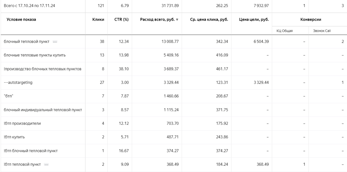 Так как спроса на целевой трафик блочных тепловых пунктов (далее БТП) было мало, то создали только 2 кампании по горячим запросам, разделенные по регионам.