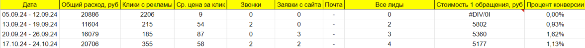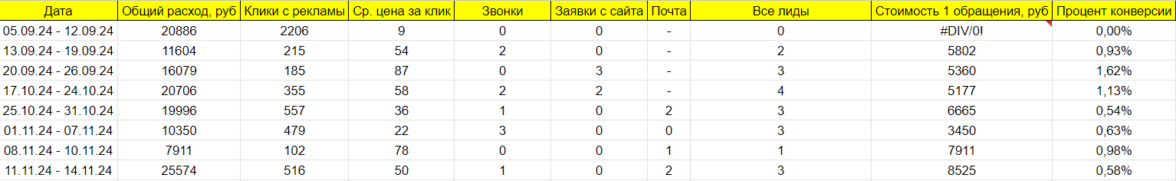 Сквозная аналитика подключена не была. От CRM системы клиент также не предоставил доступы. Поэтому, договорились о том, что будем вести журнал лидов, а клиент нам будет вовремя давать обратную связь.
