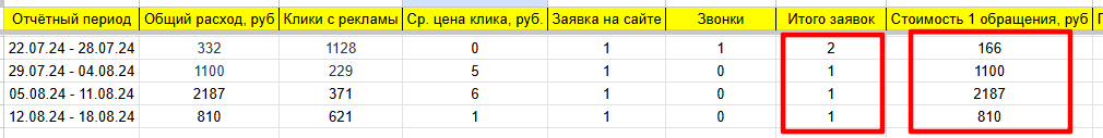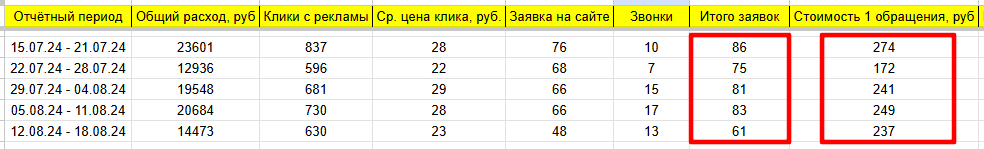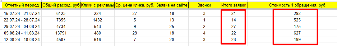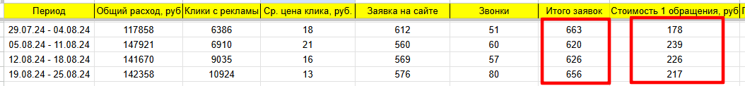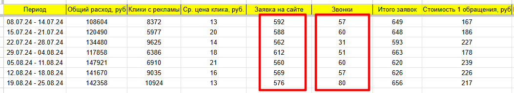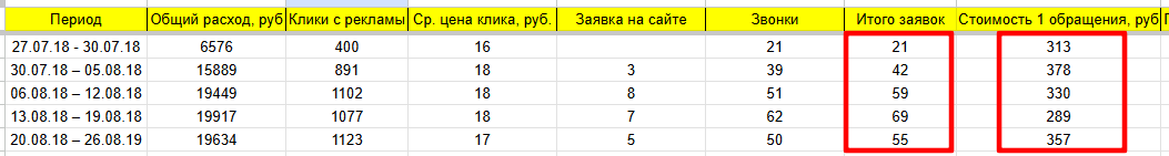 На скриншоте видно, что за период с 01.07 по 14.07 было получено 297 заявок. А за период с 12.08 по 25.08 было получено уже 523 заявки, что почти в 2 раза выше.