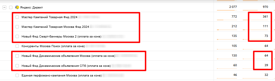 На скриншоте для примера представлены некоторые кампании, работающие по фиду, и обычные кампании: работающие на Поиске по ключевым фразам и ЕПК (единая перфоманс-кампания), работающая по интересам.