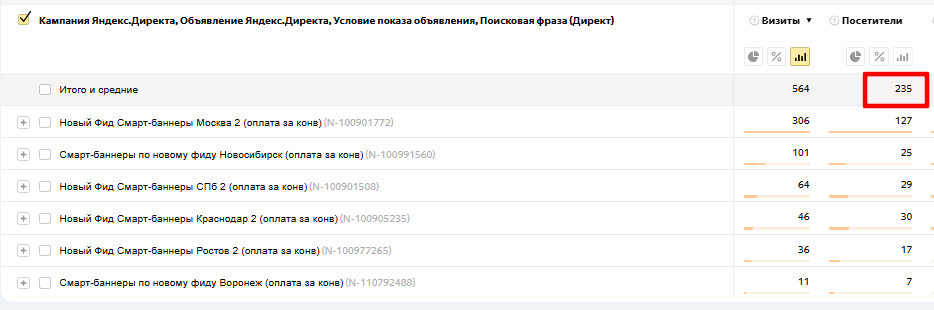 Но, поскольку нам нужно было увеличивать трафик, мы у клиента настроили кампанию типа Смарт-баннер Ретаргетинг.